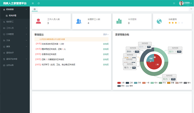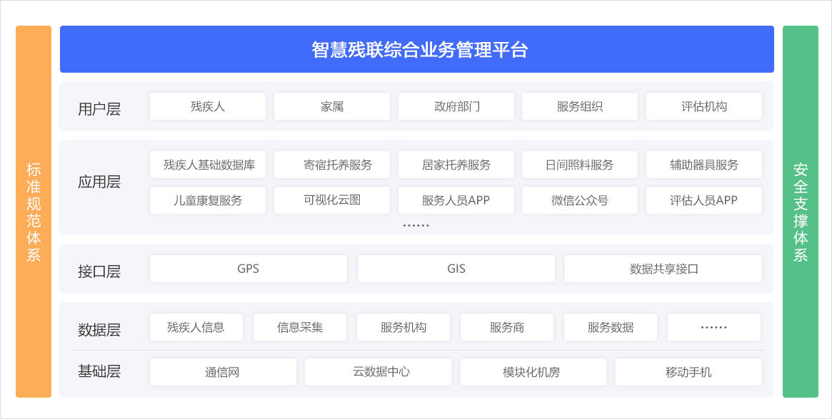 通過搭建“省-市-區(縣)-街道-社區”五級管理體系,建設殘疾人檔案、機構、輔具、康復、就業、慈善、無障礙等方面的綜合業務管理平臺,滿足主管部門的業務協同、數據交換、部門溝通等的扎口管理需求。借助“助殘服務直通車“,配套5大類助殘智能終端,提供輔具租賃、居家安防、居家探訪、兒童康復等助殘服務,實現殘聯工作統籌整合、有序管理,提高基層人員工作效率,提升殘疾人幸福感。